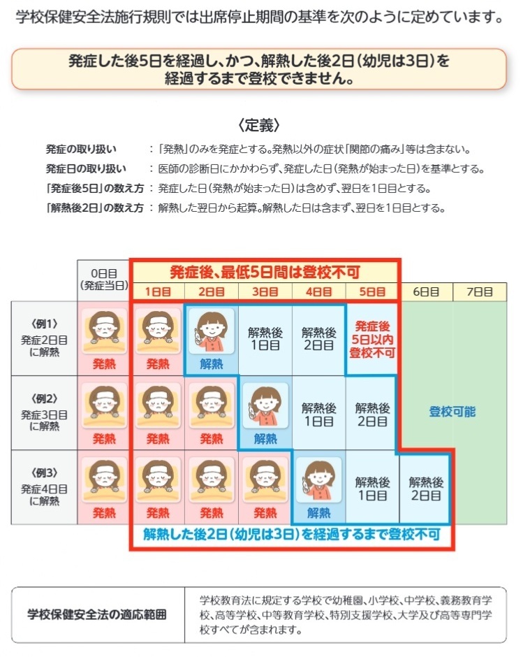 インフルエンザ・新型コロナウィルス感染症、共に出席停止期間は同じ数え方です。